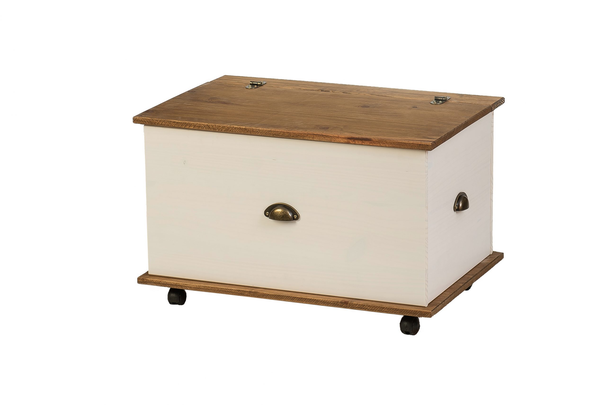 Baú em madeira maciça de reflorestamento de Pinus Elliottii com pintura em cera a base d’agua, matéria-prima e acabamento que valorizam a beleza natural dos veios da madeira conferindo originalidade e design único a cada peça. Puxadores e dobradiças na cor ouro velho. Com tampo articulável.