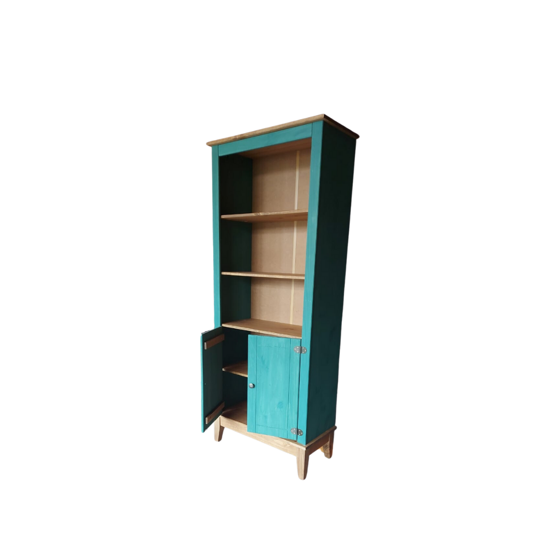 Estante em madeira maciça de reflorestamento de Pinnus Elliotii com pintura em cera a base d’agua, matéria-prima e acabamento que valorizam a beleza natural dos veios da madeira conferindo originalidade e design único a cada peça. Possui 2 prateleiras de 15mm, distribuídos uniformemente e 2 portas com 1 prateleira.