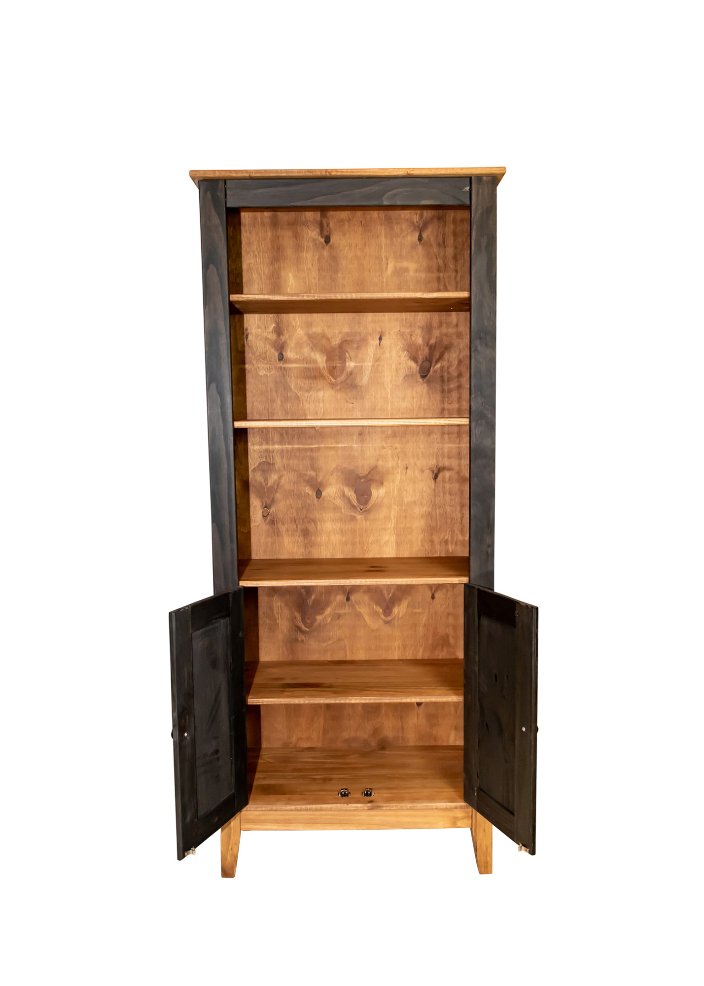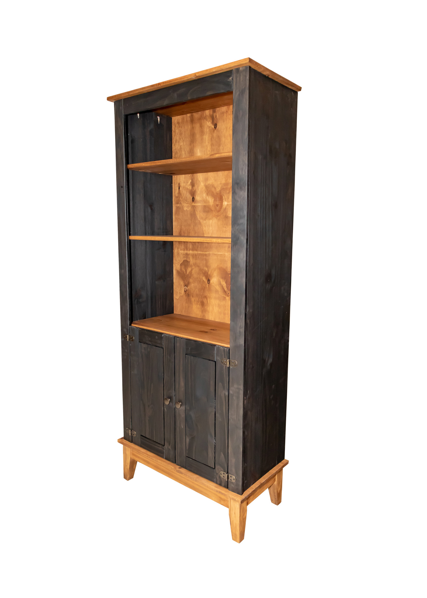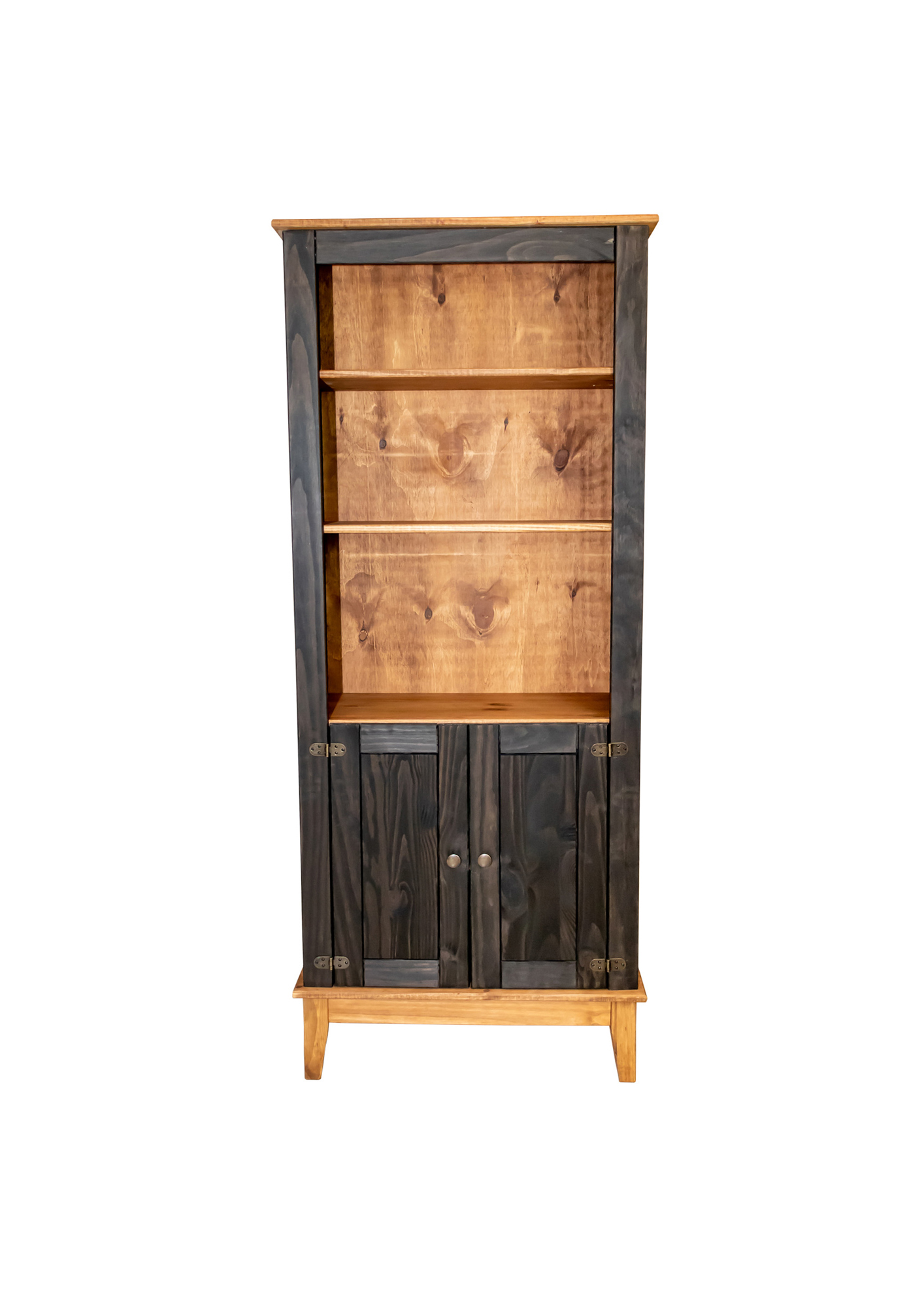 Estante em madeira maciça de reflorestamento de Pinnus Elliotii com pintura em cera a base d’agua, matéria-prima e acabamento que valorizam a beleza natural dos veios da madeira conferindo originalidade e design único a cada peça. Possui 2 prateleiras de 15mm, distribuídos uniformemente e 2 portas com 1 prateleira.